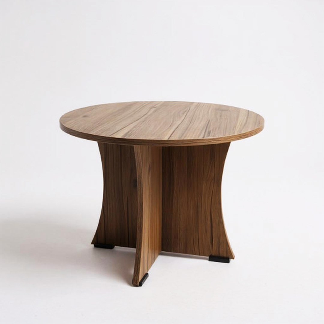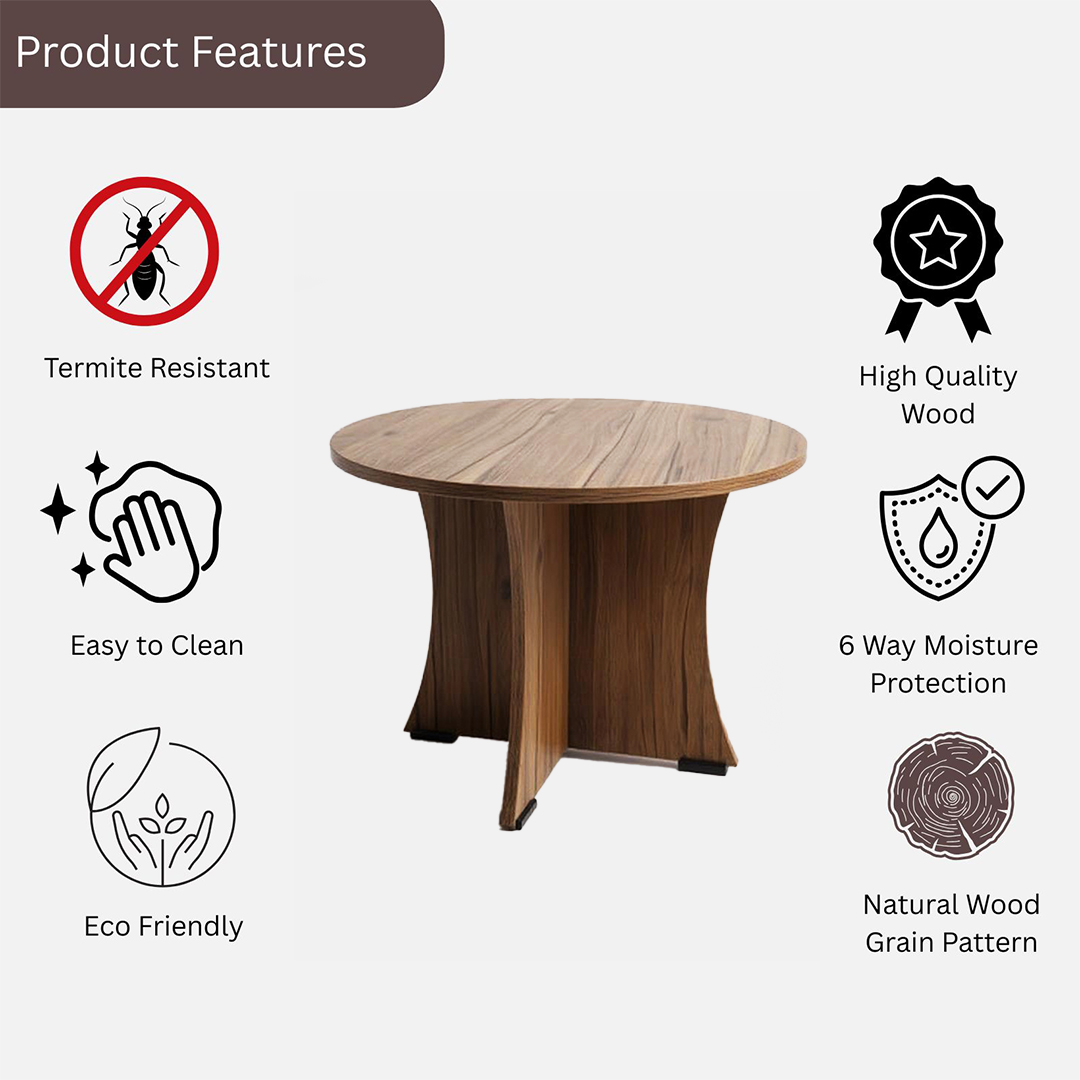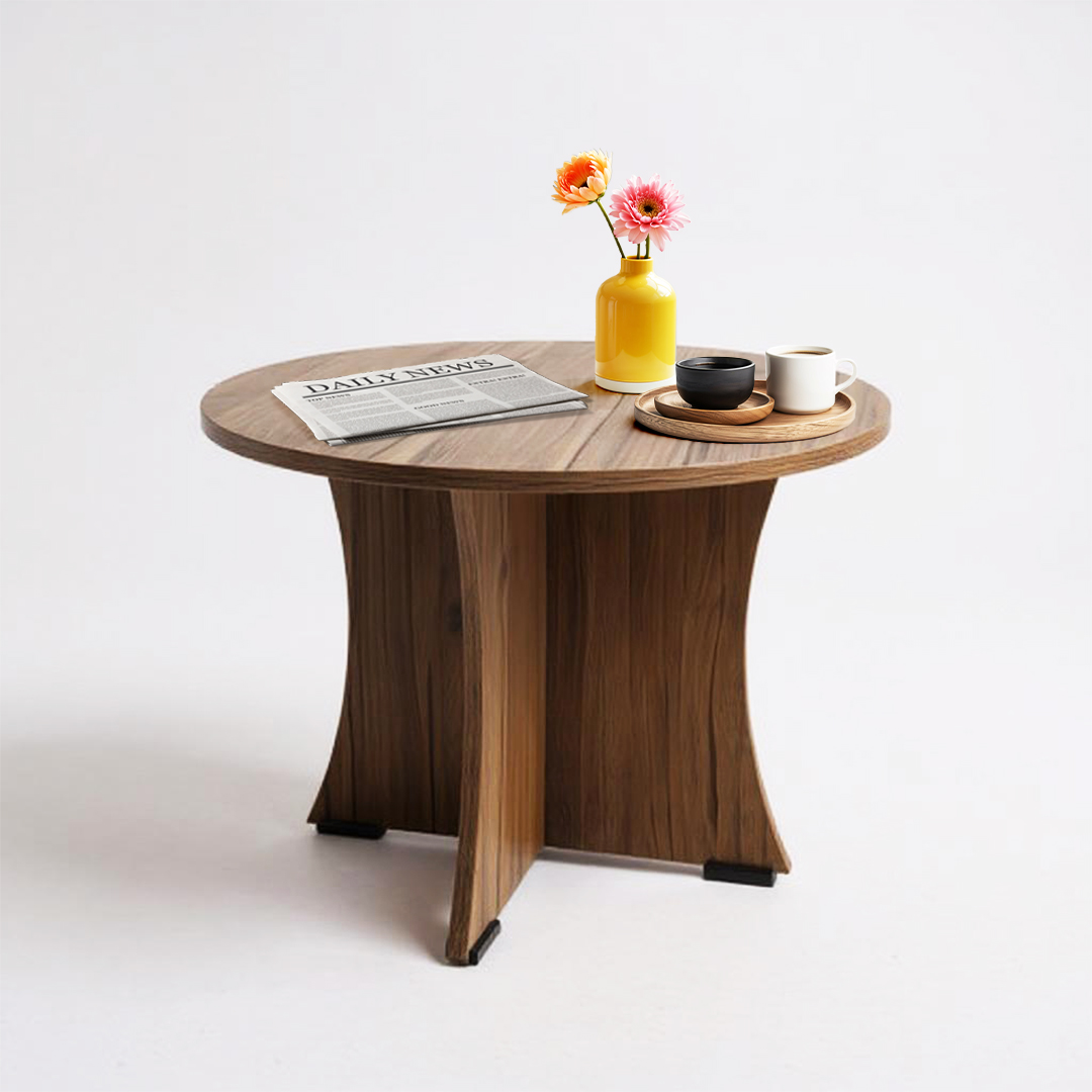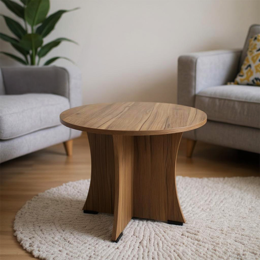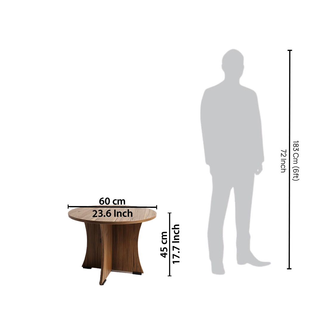 Elevate your living space with this elegant round coffee table from KIK. Featuring a distinctive curved base design and premium wood construction with natural grain patterns, this versatile table measures 60 cm in diameter and stands 45 cm tall – perfect for small spaces. The table showcases superior craftsmanship with termite-resistant treatment and 6-way moisture protection, ensuring lasting durability. Its smooth, easy-to-clean surface makes it ideal for daily use, whether as a coffee table, side table, or end table in your living room, bedroom, or garden area. The Leon teak finish adds a warm, sophisticated touch that complements any décor style. The thoughtful design includes a stable base structure and comes backed by a 1-year warranty. This multipurpose table effortlessly combines functionality with style, making it an excellent addition to your home furnishings.