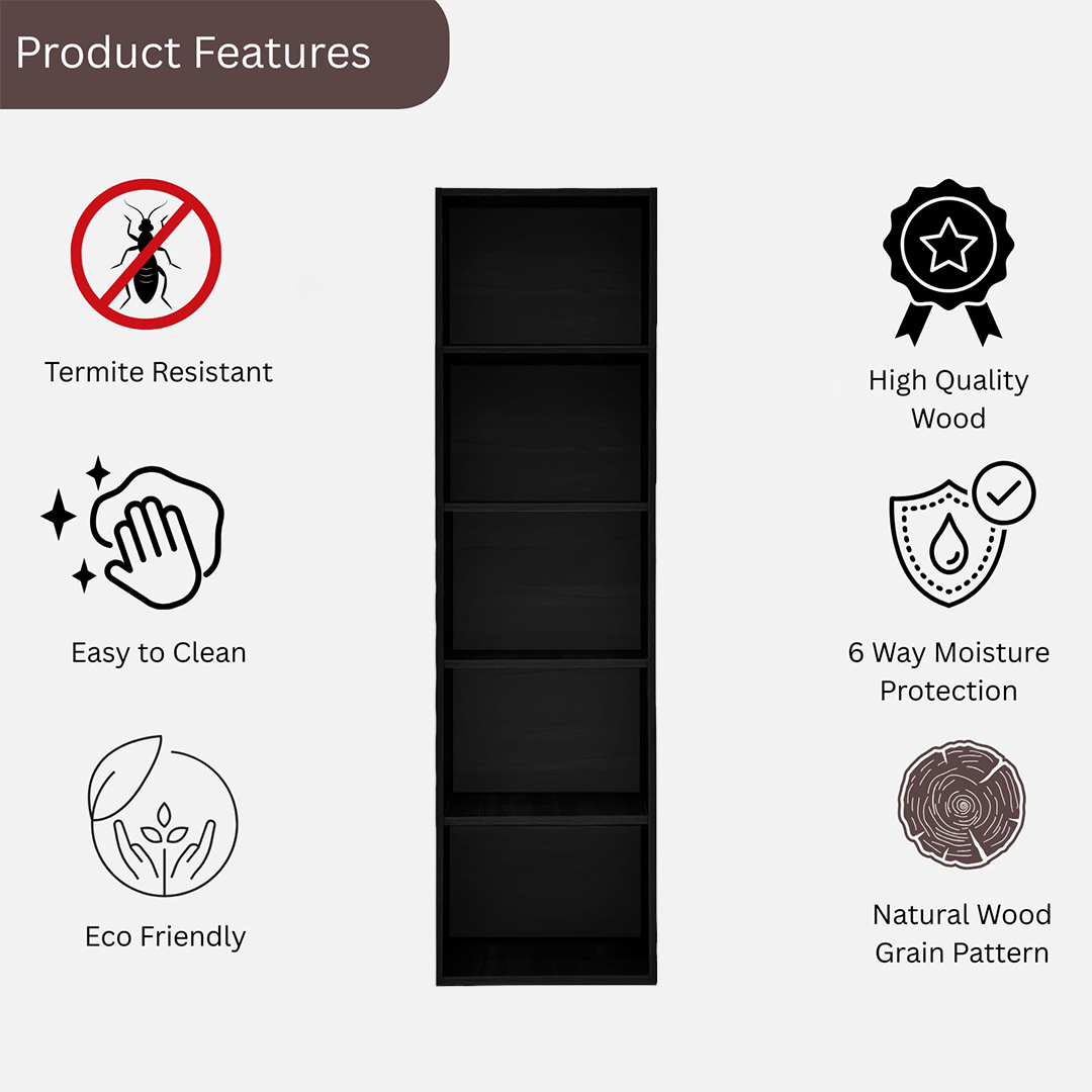 Organize your books, décor, and essentials with style using the KIK Opera 5ft Open Book Shelf – Wenge Finish. Designed for both aesthetics and functionality, this sleek bookshelf is crafted from premium engineered wood with a deep, rich Wenge finish that adds a modern and elegant touch to any space. With dimensions of 150 cm (H) × 40 cm (L) × 29 cm (W), this tall and practical shelf offers five spacious compartments, making it perfect for keeping books, files, decorative items, and plants organized while optimizing space in your living room, bedroom, study, or office. Built for long-lasting performance, the bookshelf features termite-resistant and 6-way moisture protection, ensuring it withstands wear and tear. Its smooth surfaces are easy to clean, while eco-friendly materials support a sustainable lifestyle. Combining functionality with a contemporary design, the KIK Opera 5ft Open Book Shelf – Wenge Finish is the perfect addition to keep your home tidy, stylish, and efficient.